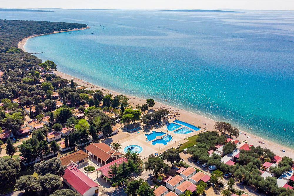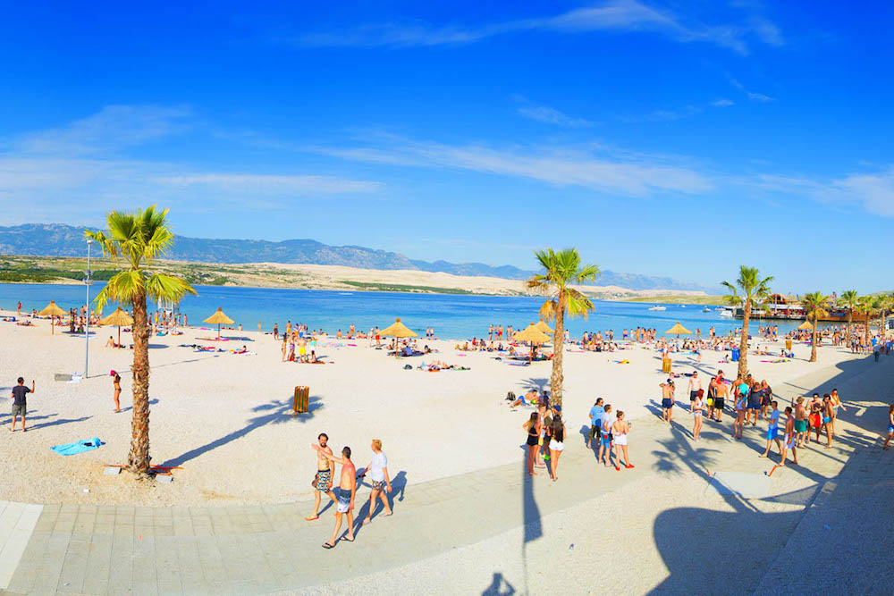 Plážštrková, kamienková, betónové plochy na slnenie, ležadlá na pláži (za poplatok), bar na pláži, známa pláž Zrće cca 3 km od hotela, jedna z najkrajších pláží ostrova - pláž Straško cca 2 km,