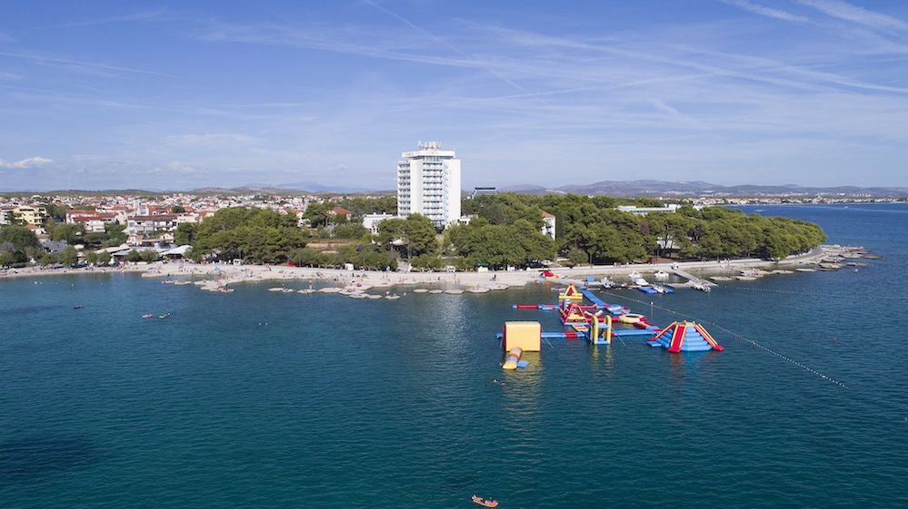 Plážskalnato - kamenistá pláž s upravenými betónovými plochami na slnenie, plážový bar (za poplatok), cca 200 m od hotela známa kamienkovo-piesočnatá pláž Plava plaža, slnečníky a ležadlá na pláži (za poplatok), nafukovací vodný park na mori,