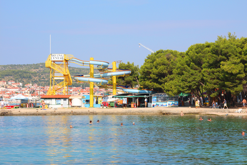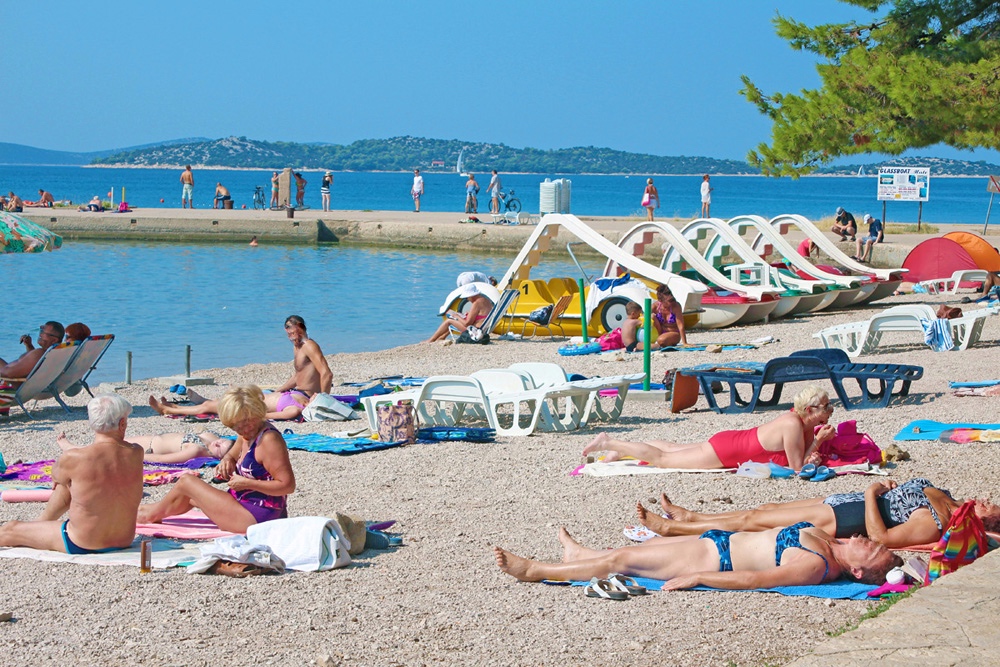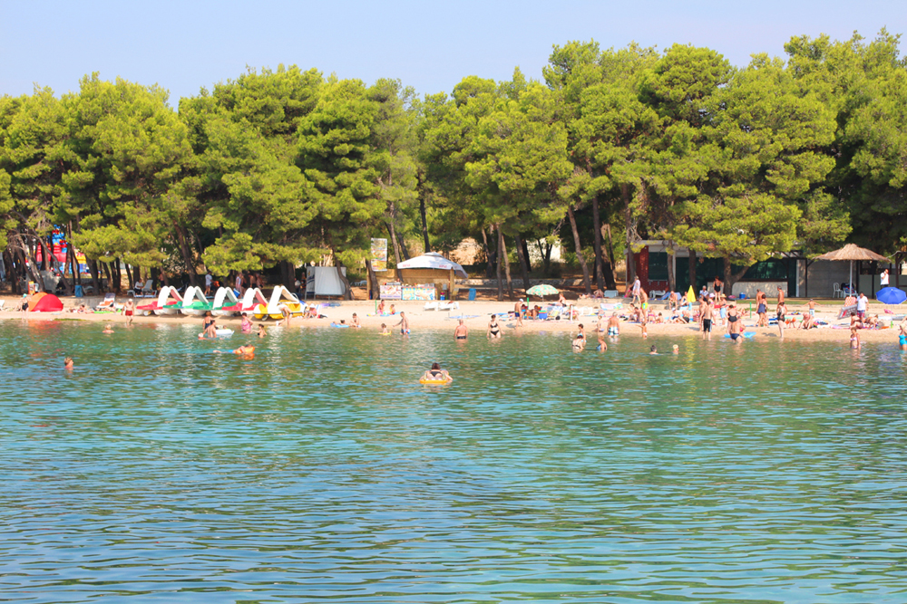 Plážkamienkovo-štrková pláž s pozvoľným vstupom do mora, betónové móla určené na opaľovanie a slnenie, sprchy (za poplatok), kabínky na prezliekanie, ležadlá a slnečníky (za poplatok),