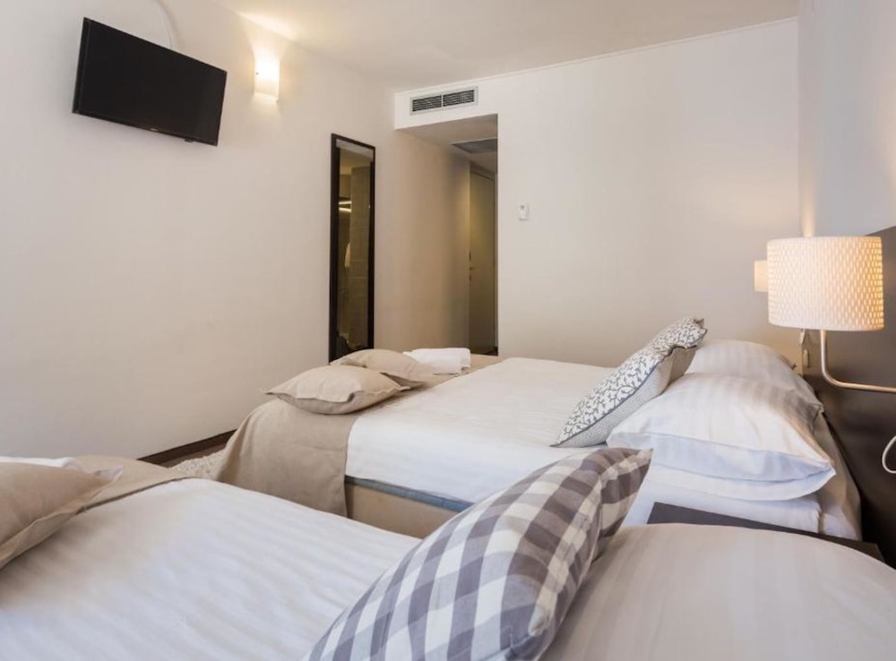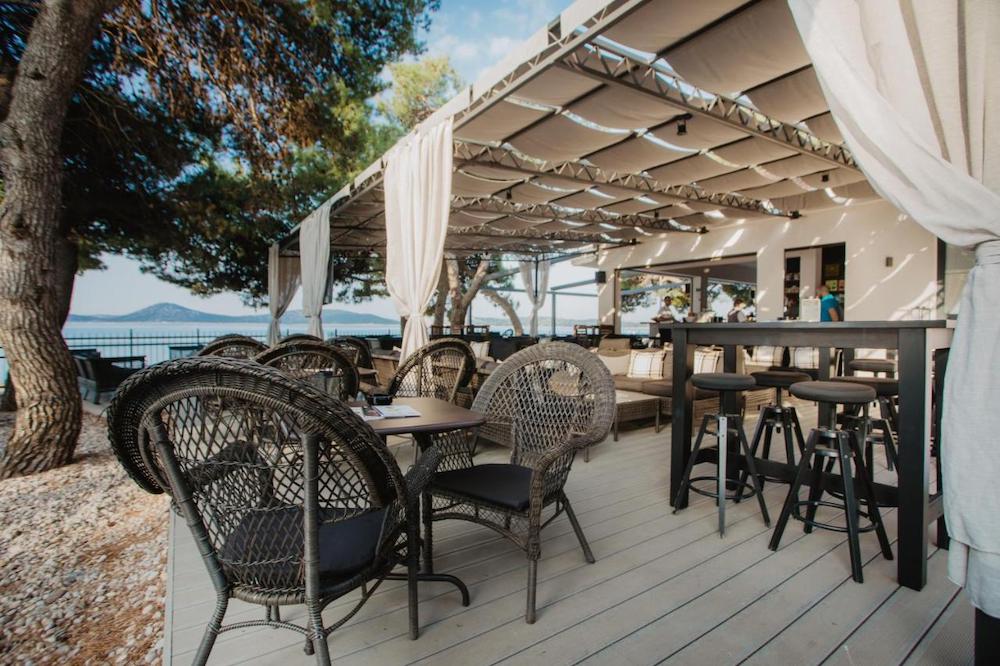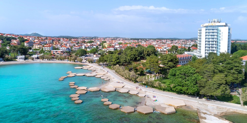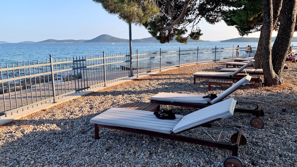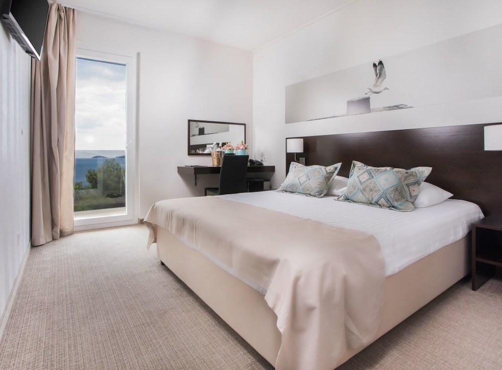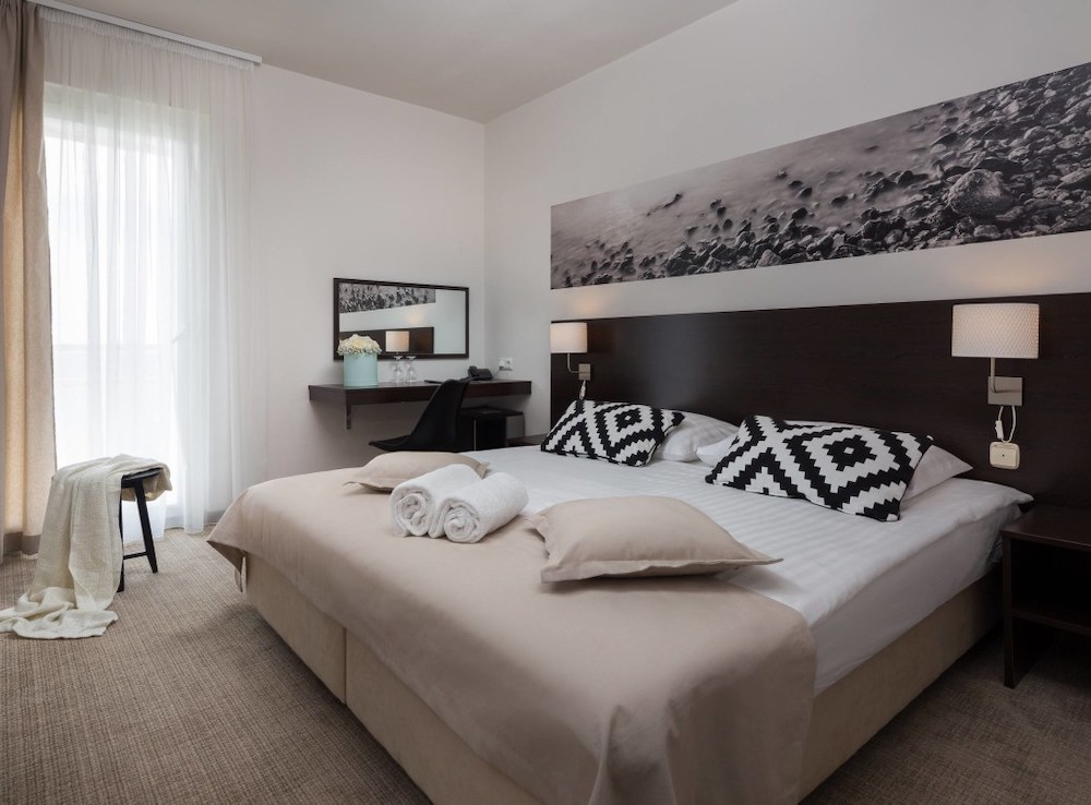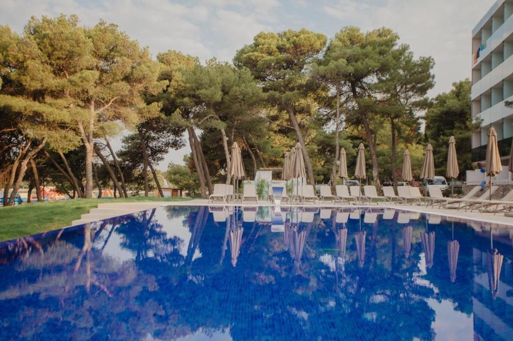 Plážskalnoto - kamenistá pláž s upravenými betónovými plochami na slnenie, plážový bar (za poplatok), cca 200 m od hotela známa kamienkovo-piesočnatá pláž Plava plaža, slnečníky a ležadlá na pláži (za poplatok), nafukovací vodný park na mori,